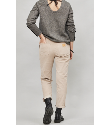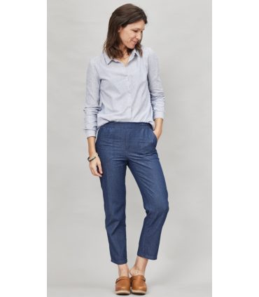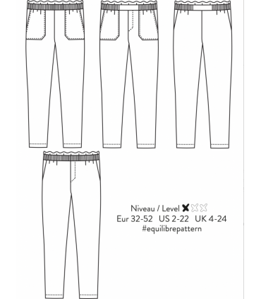 Pantalon 7/8 de forme carotte aux détails simples mais soignés. Sa taille élastiquée lui apporte confort et facilité d'exécution tout en limitant le volume de tissu induit. Poches plaquées au dos, et plaquées ou italiennes sur le devant. Option fausse braguette idéale pour débuter en couture.