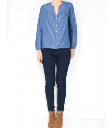 L’empiècement, entièrement doublé pour des finitions au top, dessine une ligne oblique sur le devant et droite dans le dos. Les fronces situées en-dessus font écho à celles disposées en bas de manche, terminée par un bracelet de poignet. Finitions coutures anglaises pour un intérieur impeccable.