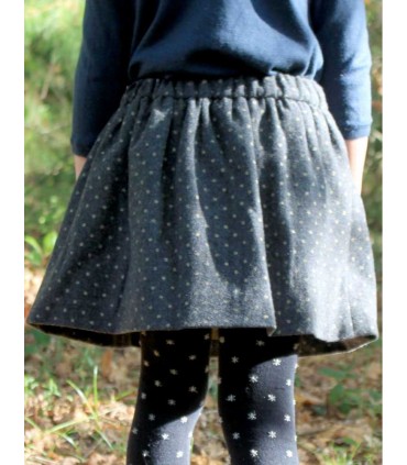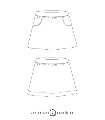 Froncette est une jupette réversible avec deux grandes poches, une ceinture droite sur le devant et froncée au dos pour plus de confort.