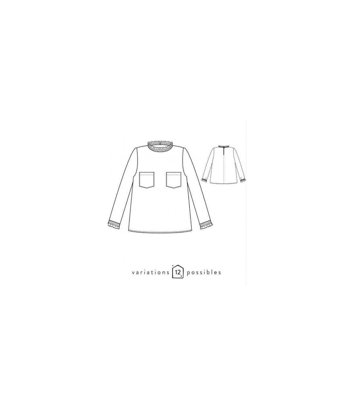 Passion est une blouse au col montant style victorien avec deux finitions possibles : soit smocké à la machine, soit pied de col avec froufrou. Manches courtes ou longues avec des finitions identiques au col. Blouse légèrement cintrée et absence de pince poitrine pour un style résolument actuel. Les poches plaquées sur la poitrine confèrent un joli contraste à cette blouse plutôt classique.