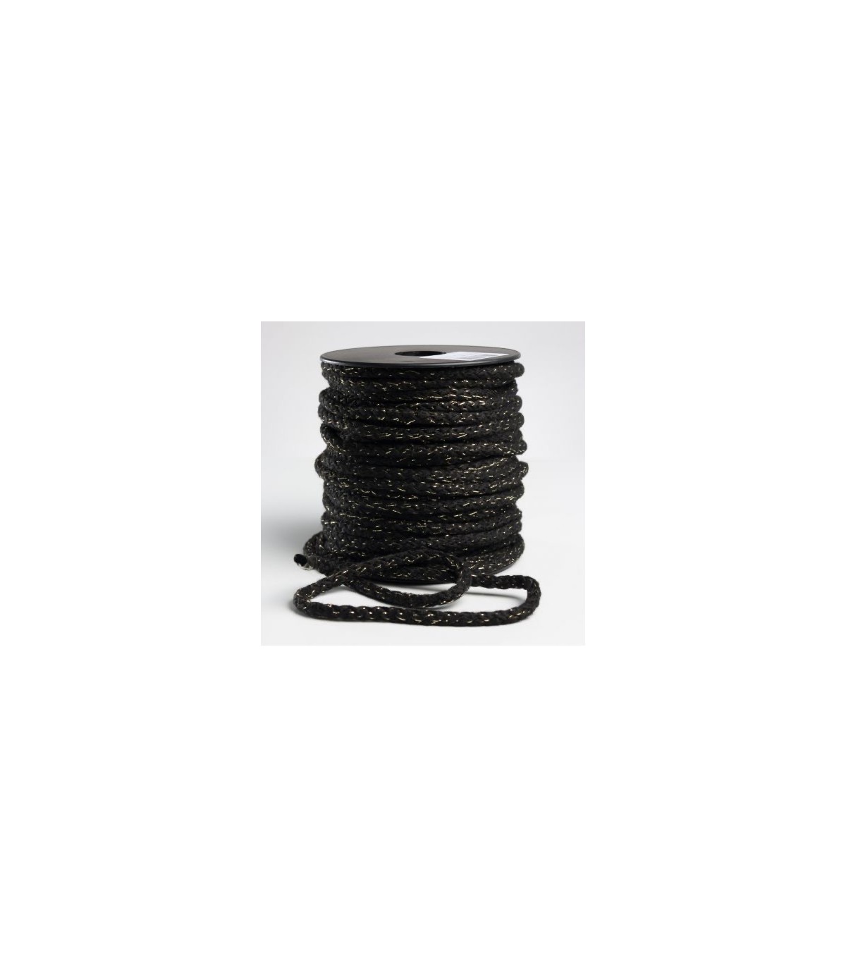 Cordon en Coton noir lurex de 6mm de large. Il est résistant et idéal pour fermer vos capuches; vos sweats; vos jogging. Le cordon est à insérer dans une coulisse. Vendu par multiple de 0.1m avec un minimum de 0.5m de coupe de départ.