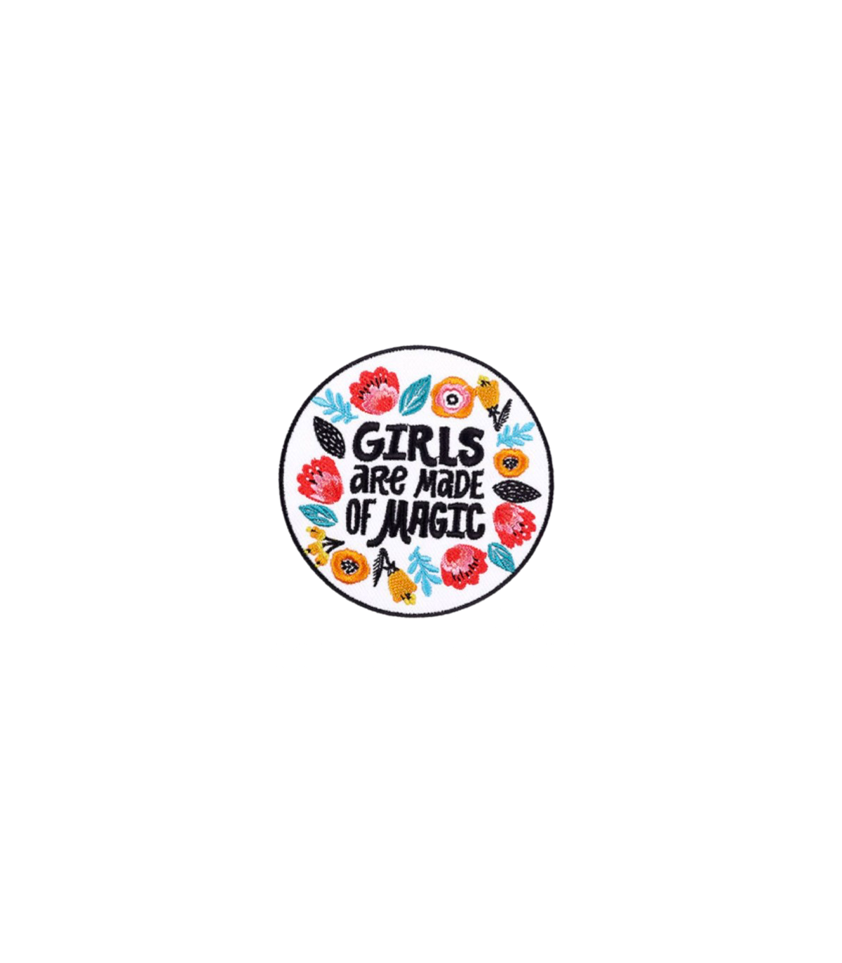 Patch brodé thermocollant rond représentant l'écriture « GIRLS ARE MADE OF MAGIC » entourée de jolies petites fleurs.