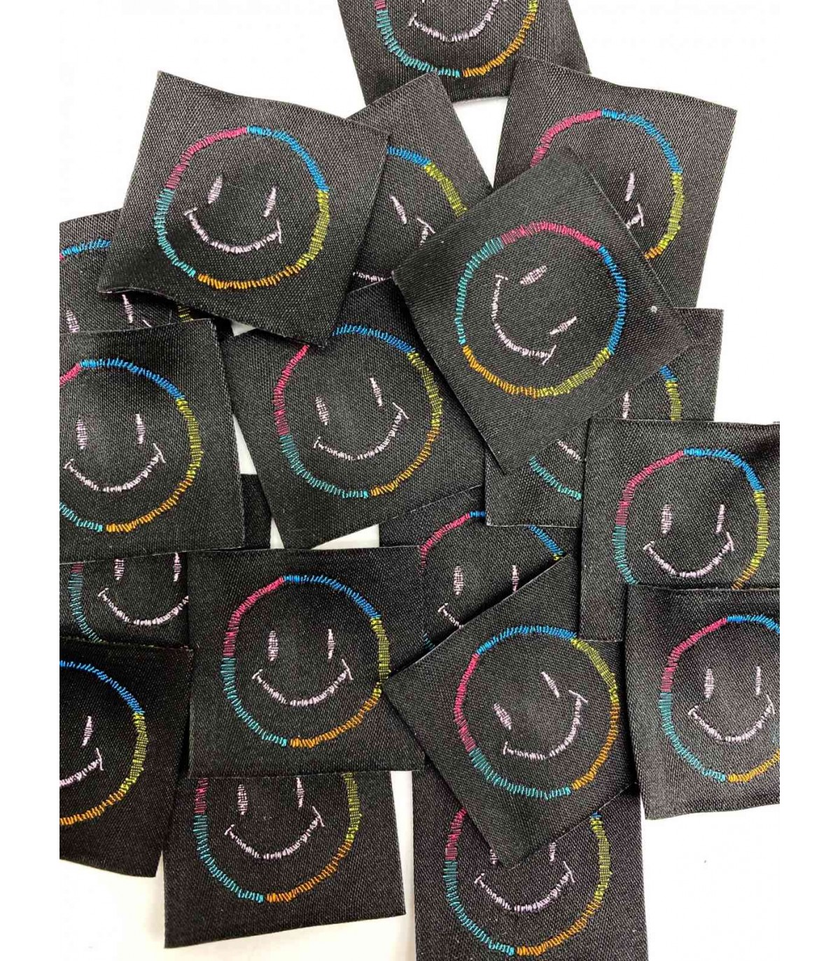 Imaginée par L’étiquette Home Couture, cette étiquette tissée de couleur noire avec un joli smiley multicolore est à coudre sur vos vêtements.