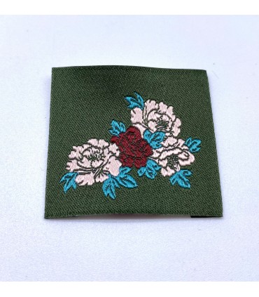 Imaginée par L’étiquette Home Couture, cette étiquette tissée de couleur kaki avec de jolies pivoines est à coudre sur vos vêtements.