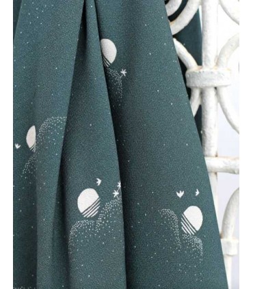 Le motif Soleils se décline ici dans la couleur Paon. Il est imprimé sur un crêpe de viscose souple qui vient ajouter un relief à ce motif léger et disséminé.