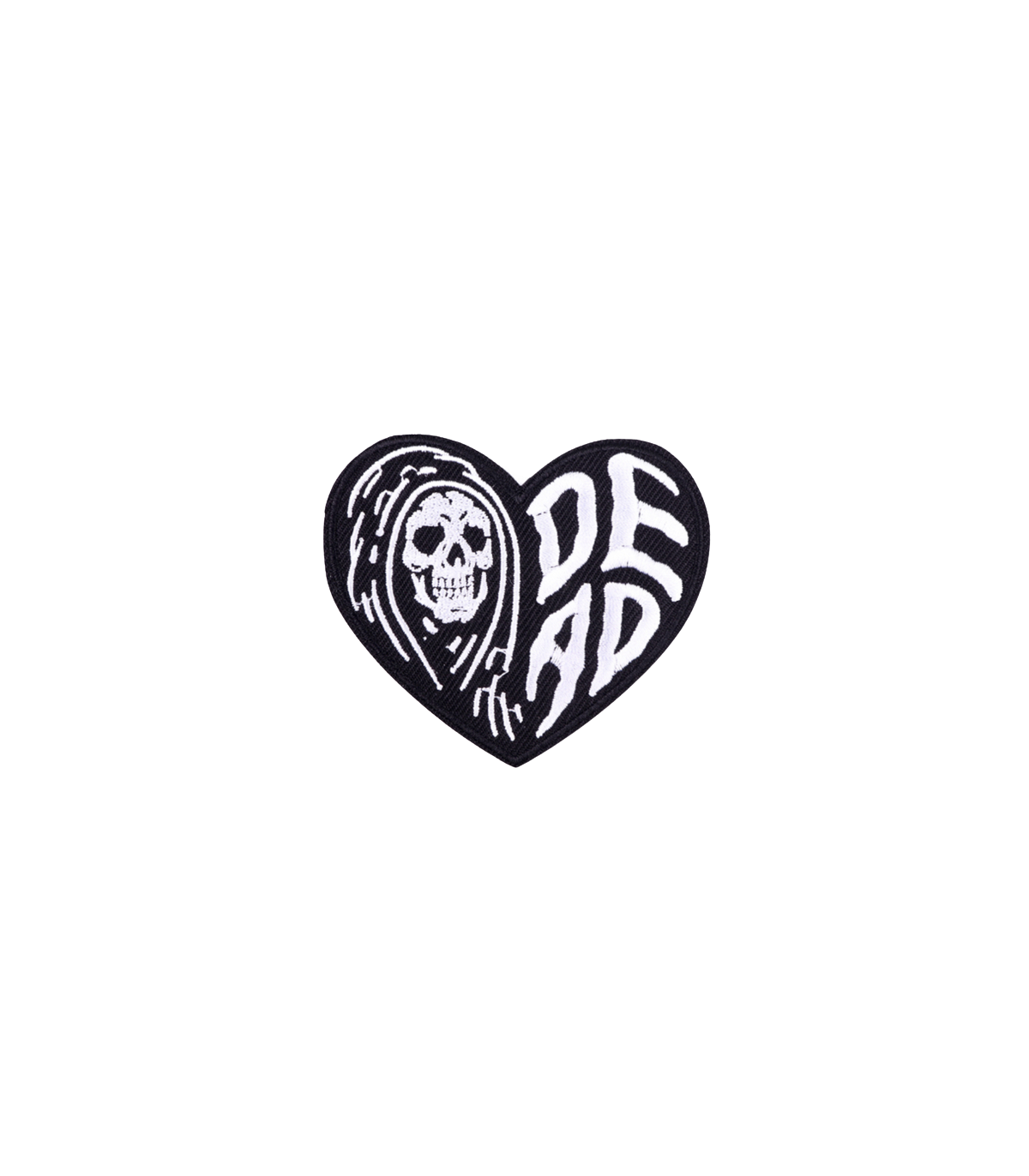 Patch thermocollant représentant un cœur noir avec un squelette à gauche et l’inscription « DEAD » à droite.