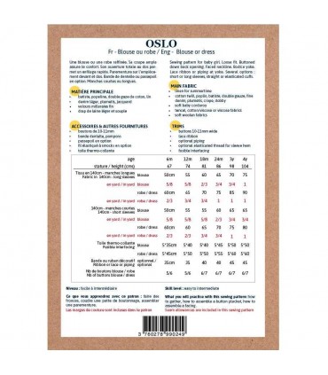 Âge 6m 12m 18m 24m 3a 4a Stature en cm 67 74 81 86 98 104 tissu en 140cm - manches longues - blouse 50 55 60 65 70 75 tissu en 140cm - manches longues - robe 60 65 70 75 85 90 tissu en 140cm - manches courtes- blouse 50 55 55 60 65 65 tissu en 140cm - manches courtes - robe 60 60 65 70 75 80 toile thermo-collante fine 5*45 5*50 5*50 5*55 5*60 5*60 ruban décoratif (dentelle ou passepoil...) 35 35 40 40 45 45 nombre de boutons de 10mm (blouse/robe) 5/6 5/6 6/7 6/7 6/7 6/7