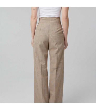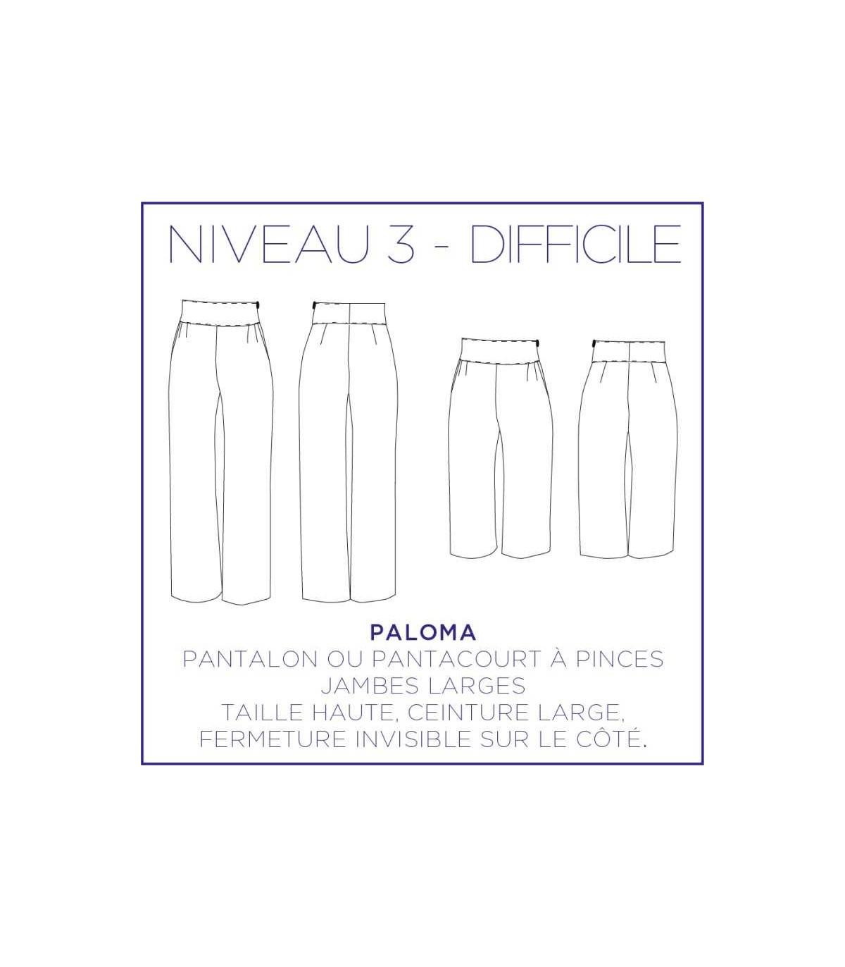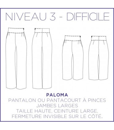Paloma est un pantalon ou un pantacourt à pinces avec des jambes larges et une taille haute . Ce modèle est fermé avec une fermeture invisible sur le côté.