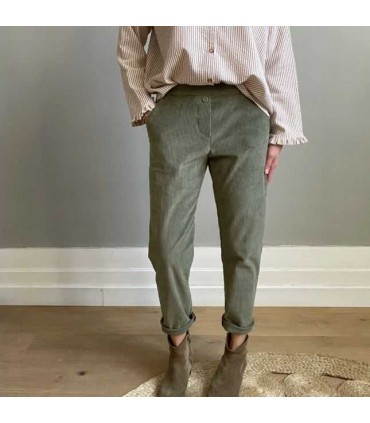 Maison essentielle a crée le patron "le fameux pantalon". Ce fameux pantalon est un bon basique avec une coupe intemporelle et confortable. Il est sans pince et sans fermeture . Mais avec une taille élastique.