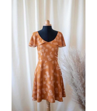 Inspirée du motif Pâquerette, de jolis volants sur les épaules viennent sublimer le décolleté en V sur le devant et le dos. Sa coupe flatteuse met la taille en valeur grâce aux pinces et à sa jupe patineuse qui tourne juste comme on aime..