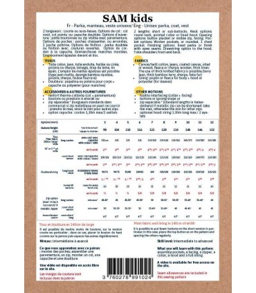 Age 3 4 5 6 7 8 9 10 11 12 Stature en cm 98 104 110 116 122 128 134 140 146 152 Tissu extérieur en 140cm de large version longue avec col 115 120 125 125 125 135 135 145 150 155 avec capuche 115 120 125 125 150 160 165 170 180 185 version courte avec col 100 105 110 115 120 125 130 135 140 150 avec capuche 105 110 115 120 145 150 160 160 170 180 Doublure version longue si tout doublé 90 90 95 100 100 105 110 115 120 125 version courte si tout doublé 75 75 80 85 100 100 105 105 110 115 toutes versions que capuche 50 50 50 55 55 55 55 55 55 60 option zip (max* zip métal à raccourci) version longue min-max* 40-45* 45 45-50* 45-50* 50 50-55* 50-55* 55-60* 55-60* 60 version courte min-max* 30 30-35* 30-35* 35 35-40* 35-40* 40 40-45* 45 45 Boutons ou pressions courte/longue 6/7 6/7 6/7 6/7 6/7 6/7 6/7 6/7 6/7 6/7 - toile fine thermo-collante (dessous col + parementure)