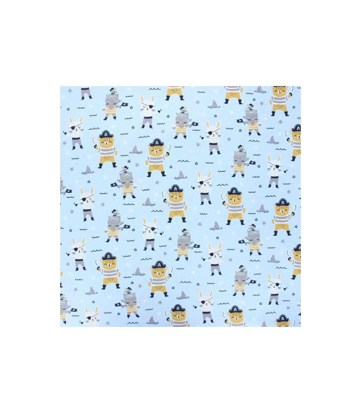 Popeline de coton aux motifs enfantins avec des animaux pirates sur un fonds bleu idéale pour de jolis accessoires , décoration ou vêtements.