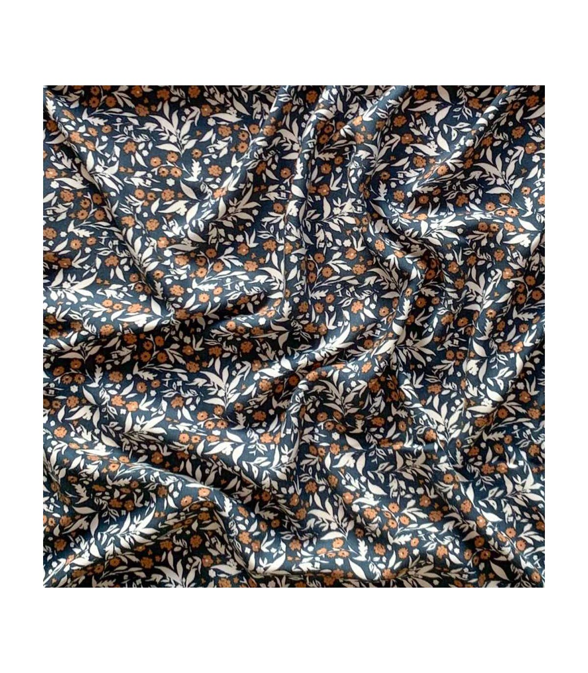 Une jolie viscose imprimée d'un motif fleuri cassonade et des feuilles crèmes sur fond Nuit Le motif composé d'un ensemble de 2 fleurs mesure 7 cm de lare sur 4 an de hauteur Nous vous proposons de coudre cette viscose en une robe telle que Wallis de de Cha' Coud ou une jupe telle Jupette de Singulière par Cousette Nous vous conseillons de le coudre avec le fil Gutermann Polyester n°537 et de le coudre avec des aiguilles microtex Minimum de coupe 0.5m et après par tranche de 0.1m ( donc 0.6m, 0.7m, 0.8m...).